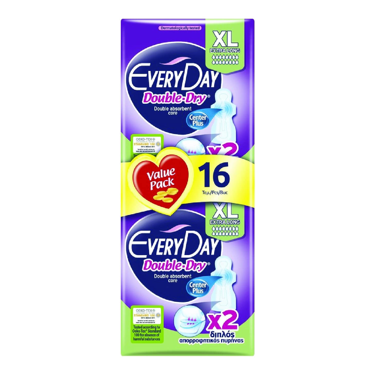 Everyday Double-Dry Extra Long XL хигиенски влошки нудат двојна заштита и продолжена покриеност за максимална сигурност во текот на денот или ноќта. Благодарение на иновативната Double-Dry технологија, секоја влошка овозможува двослојна апсорпција, спречувајќи влага и непријатно чувство.